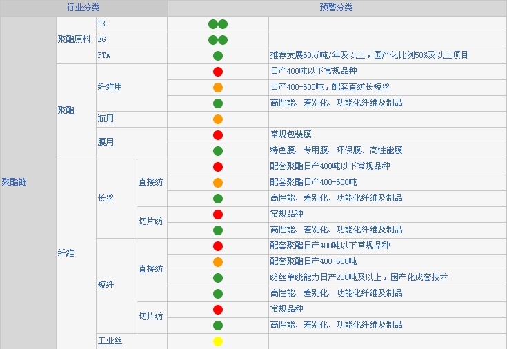 本預警系統監測的品種涵蓋化纖行業主要產品,分為紅、橙、黃、綠、雙綠五種類別,分別代表風險極大,風險較大、有一定風險、鼓勵發展、重點扶持??梢越Y合預警類別及內容,根據企業生產經營實際情況進行判斷。